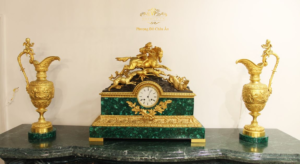 Tượng vàng trên nền bệ đồng hồ đá xanh biếc đặc trưng của loại đá Malachite quý hiếm.