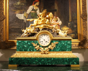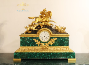 Đồng hồ đá xanh malachite với tượng mô tả cuộc đi săn của hoàng đế Napoleon.